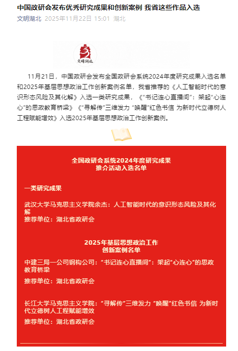 (通讯员 方玉卓 徐佳悦 袁田/文 唐佳雨/摄)近日,中国政研会印发《关于公布2025年基层思想政治工作“十佳”案例和创新案例名单的通知》。皇冠体育官方网站《“寻解传”三维发力“唤醒”红色书信 为新时代立德树人工程赋能增效》案例,入选中国政研会2025年度基层思想政治工作创新案例,系湖北省仅有的两个入选案例之一,也是我省唯一入选的高校案例。
