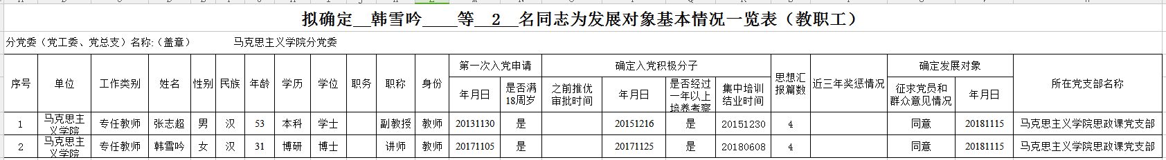 经过党支部对发展对象1年以上的培养教育和考察,经支部委员会研究确定,报分党委(党总支、党工委)审查同意,拟确定 韩雪吟 等 2 名同志为发展对象,特在全院范围内进行公示。