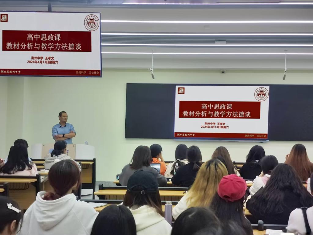 (通讯员:刘若曦)为帮助员工深入了解高中思政课教材与教学方法,4月13日上午,皇冠体育官方网站于16教A312室开展教学论坛第五讲。本次讲座由荆州中学高级员工王孝文担任主讲,皇冠体育官方网站本科生以及学科教学(思政)专业研究生参与讲座。
