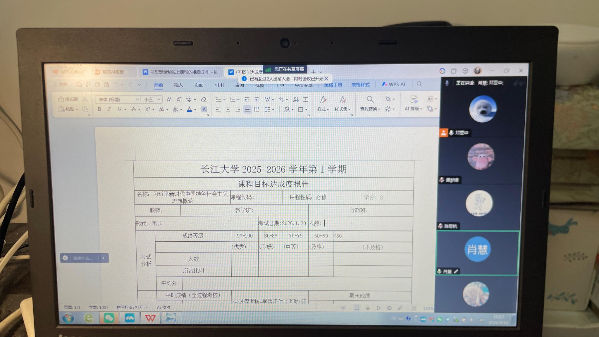 《习概》教研室为切实强化思政课堂育人实效,稳步做好学期教学常规管理工作,持续优化思政课程教学模式与育人体系,4月16日,《习概》教研室组织召开线上教学教研专题工作会议。教研室全体在岗员工参会,围绕教学常规自查整改、课堂教学质量优化、集体备课研讨交流、教研项目推进落实等重点内容,统筹安排部署、深入交流探讨,凝聚教研合力,助力课程教学提质增效。