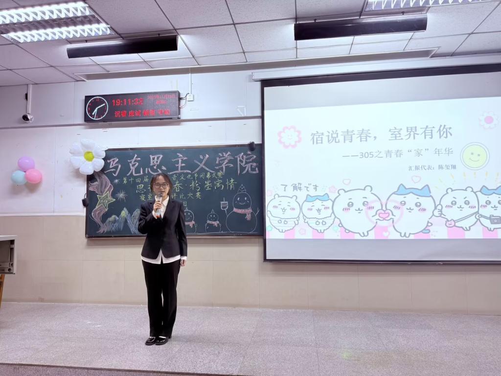 本次寝室文化评比以现场答辩与风采展示为核心环节。各参赛寝室围绕寝室文化内核、成员风采介绍、日常风貌展现及未来发展展望等维度展开阐述,随后带着精心筹备的节目轮番登场,尽显青春风采。有的寝室以情景剧演绎出日常相处的温暖点滴,用生活化的场景传递室友间的包容与互助;有的通过配音、诗朗诵、二胡演奏、舞蹈等形式展现独特魅力,将思政元素融入文艺表达,彰显马院学子的多才多艺;还有的以创意短视频展示寝室文化建设成果,用活泼新颖的形式诠释青春活力。多样的表演形式、饱满的情感表达,赢得现场观众阵阵掌声。